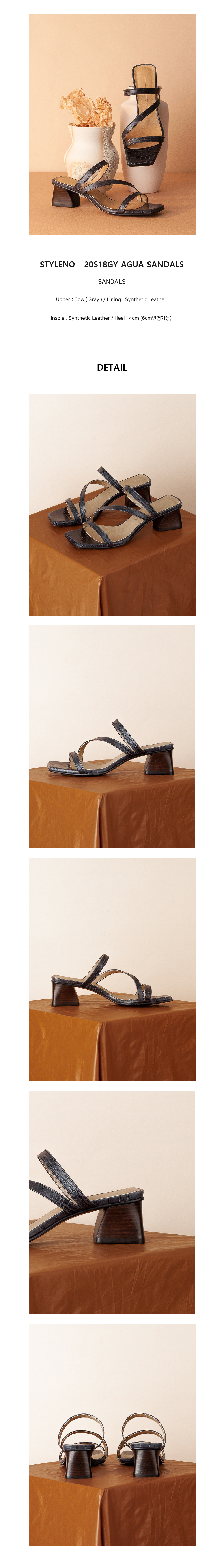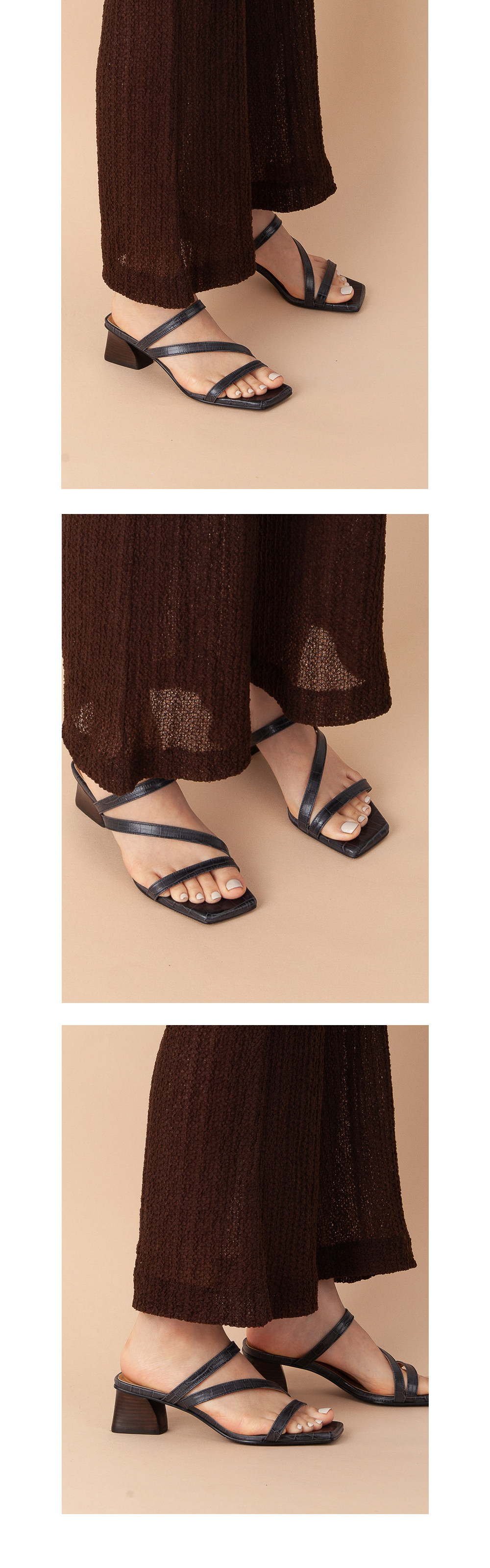 • 크로커 무늬 사선스트랩 샌들 크로커 무늬소재에 스택트 힐을 매치한 레트로한 감성의 샌들